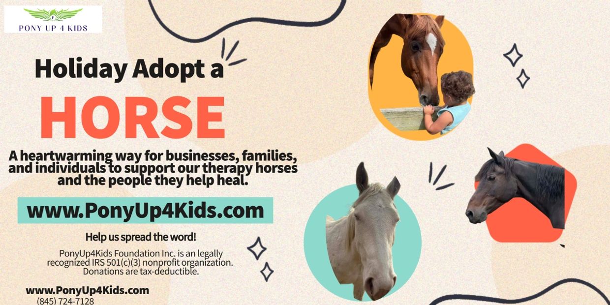 This holiday season, PonyUp4Kids Foundation invites you to join our Adopt-A-Horse Holiday Program — a meaningful way to support both our rescued horses and the people they help heal. Your generosity provides critical care for horses like Toby, Cody, Honey and Levi, while also empowering participants in our equine-assisted programs.