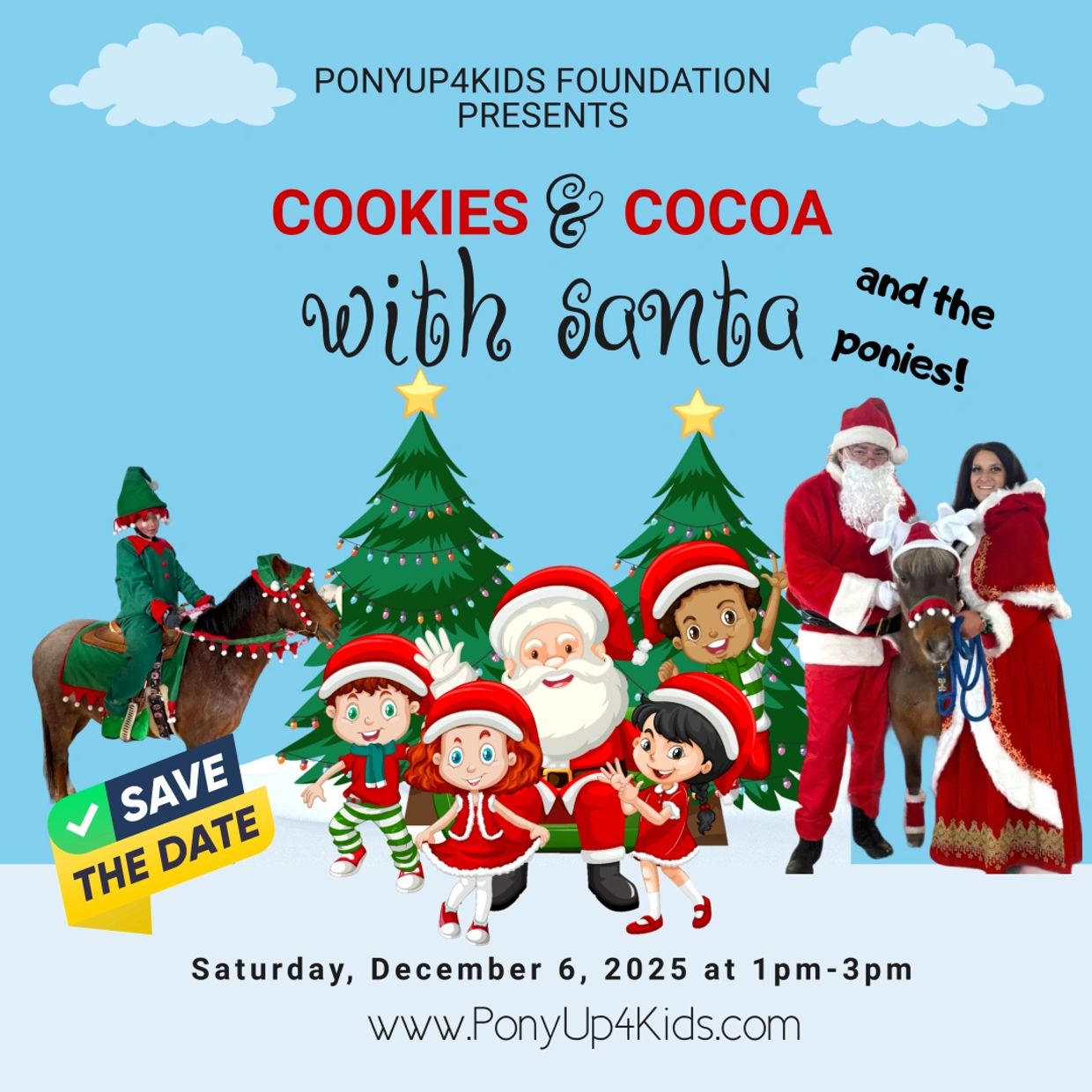 Celebrate the season with PonyUp4Kids at our beloved annual holiday event—Cookies & Cocoa with Santa and the Ponies! Join us for a cozy afternoon filled with sweet treats, warm cocoa, cheerful holiday vibes, and plenty of pony snuggles. Meet Santa, take photos, and enjoy the magic of the farm with family and friends.