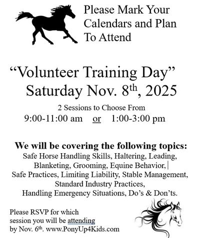 At PonyUp4Kids Foundation, we believe every volunteer has the power to make a lasting impact—not just on the lives of our participants, but on the horses who help heal them. Our 2-hour volunteer training sessions are designed to equip you with the skills and knowledge to become a capable and confident member of our community of volunteers.